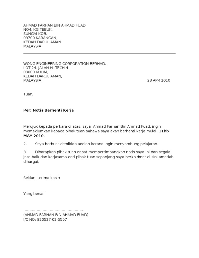 Contoh Surat Berhenti Kerja Notis Sebulan Pdf